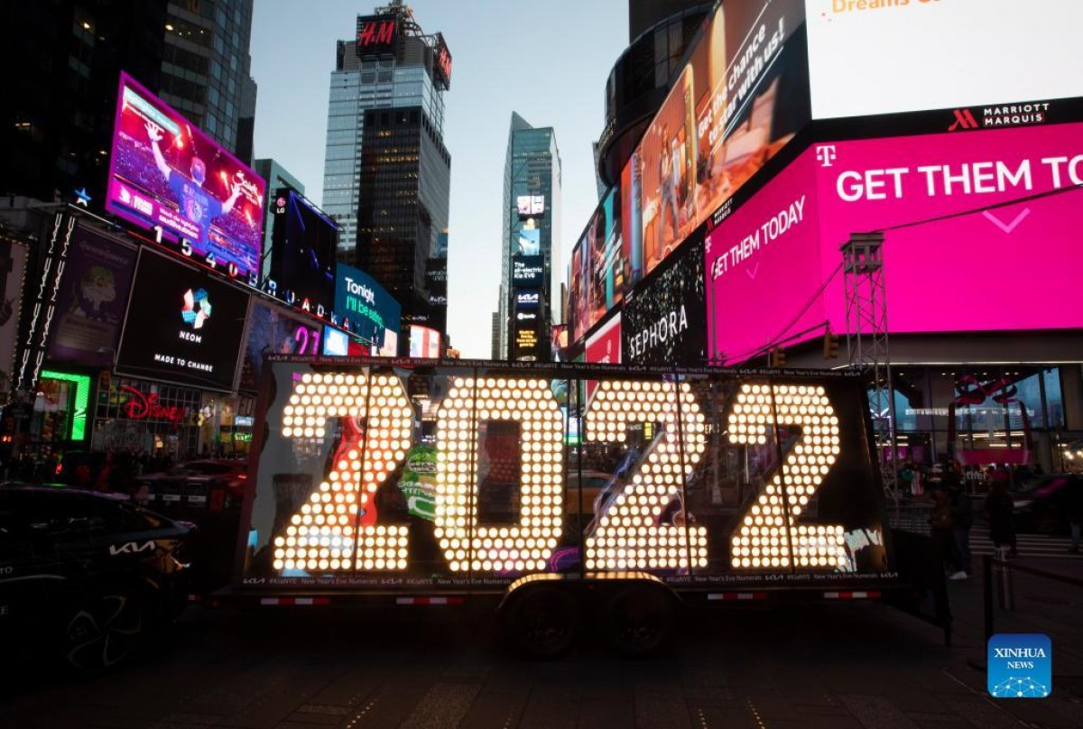 Giant, 7-foot-tall numerals for "2022" are seen on Times Square in New York. The numerals will later be placed atop One Times Square.