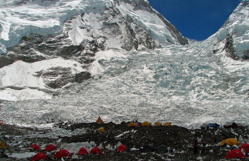 The Khumbu Icefall is a river of ice that is a kilometre long at the height of 5,550-5,800 meters. For safety, the icefall can only be crossed in the middle of the night or early morning. During the day, the melting of the snow and glaciers cause the risk of an avalanche to escalate. This icefall alone has caused the death of 44 mountaineers from 1953 to 2016.