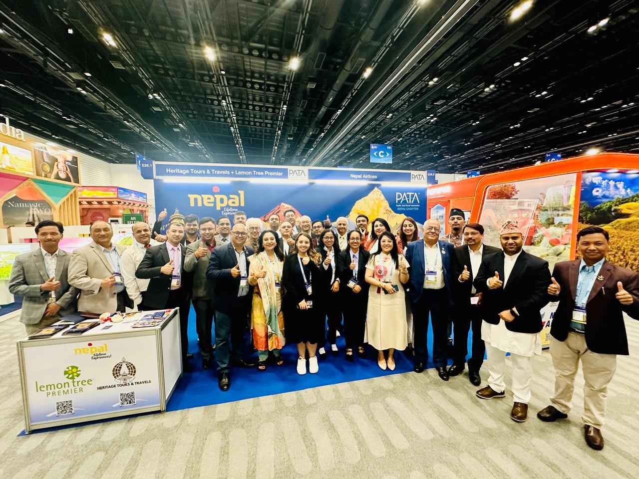 The 18 exhibitors under the Nepal pavilion at PTM 2024 included Heritage Tours & Travels, Lemon Tree Premier, Nepal Airlines Corporation, Bhrikuti Himalayan Treks, Destinago Tours & Travels, Hotel Himalaya, Expedition Himalaya, Hotel Ratnasambhava, Community Homestay Network, Luxury DMC Travels, Himalayan Holidays Trekking, Buddhist Circuits.com, Siddhartha Business Group of Hospitality, KGH Group of Hotels, Euro Asia Tours & Travels, Mountain Tiger Nepal, Visit Himalaya Treks, Off the Wall Trekking, and Nepal Yoga Home.