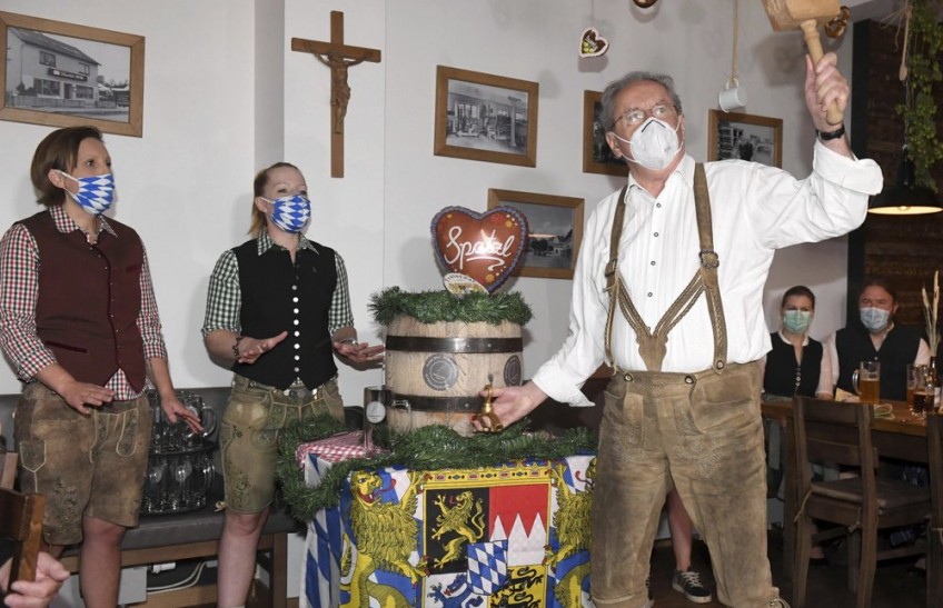 Former Mayor Christian Ude got the party started, hammering a tap into a 20 liter (5 gallon) keg — a tenth of the size of the Oktoberfest norm — at the Schillerbraeu beer hall while dressed in Bavarian lederhosen leather pants and wearing a protective mask.