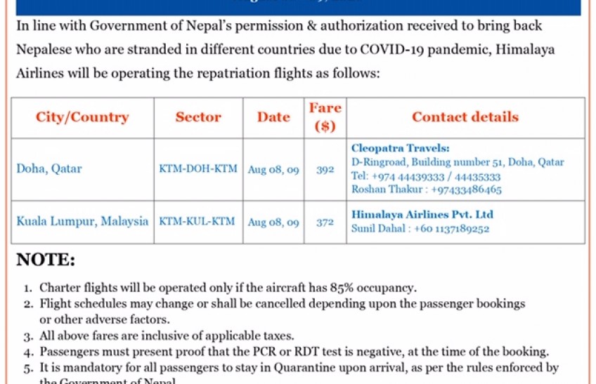 In line with the Government of Nepal’s permission & authorization received to bring back Nepalese stranded in different countries due to the COVID-19 pandemic, Himalaya Airlines has been operating repatriation flights. Recently it has shared the details of its repatriation flights from August 8 to 9.