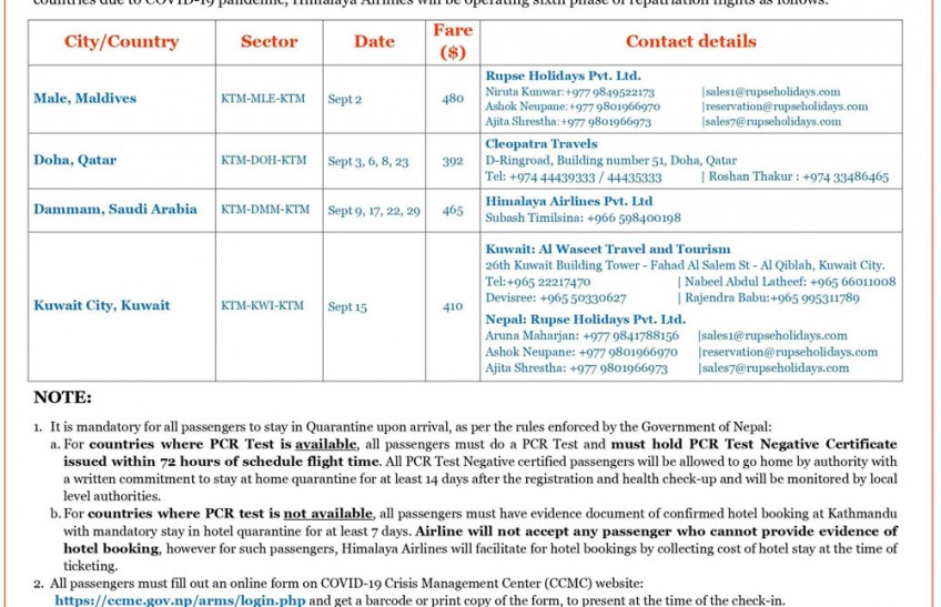 In line with the Government of Nepal’s permission & authorization received to bring back Nepalese stranded in different countries due to the COVID-19 pandemic, Himalaya Airlines will be operating repatriation flights from September 2 to 29, 2020.