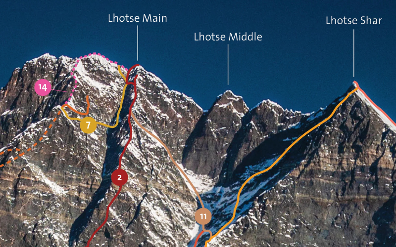 Lhotse’s south face is among the most dramatic walls in the Himalayas, a near-vertical sweep of ice and rock rising more than 3,000 metres, long regarded as one of the great challenges in high-altitude climbing.