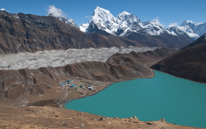 From the summit of Gokyo Ri (5,357m), trekkers are rewarded with one of the finest panoramas in Nepal. The viewpoint overlooks the full expanse of the glacier alongside the Gokyo Lakes.