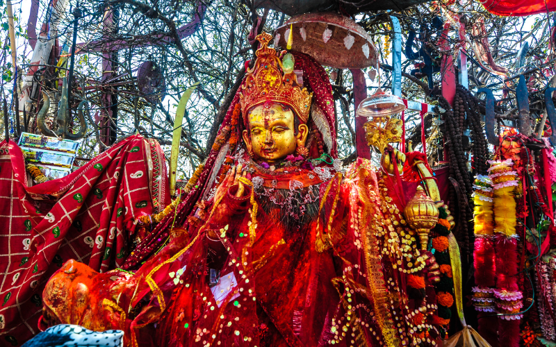 At the heart of the temple lies the sanctum housing the revered deity. The sacred space is adorned with bells, prayer flags, metal tridents, copper offerings, and ritual lamps, reflecting a fusion of Hindu and Himalayan devotional aesthetics.