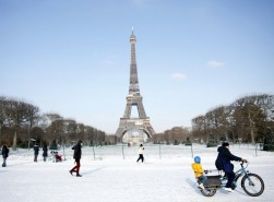 Workers at the Eiffel Tower used a blowtorch to melt the ice collecting on its surfaces and snow was blocking roads and halting trains.